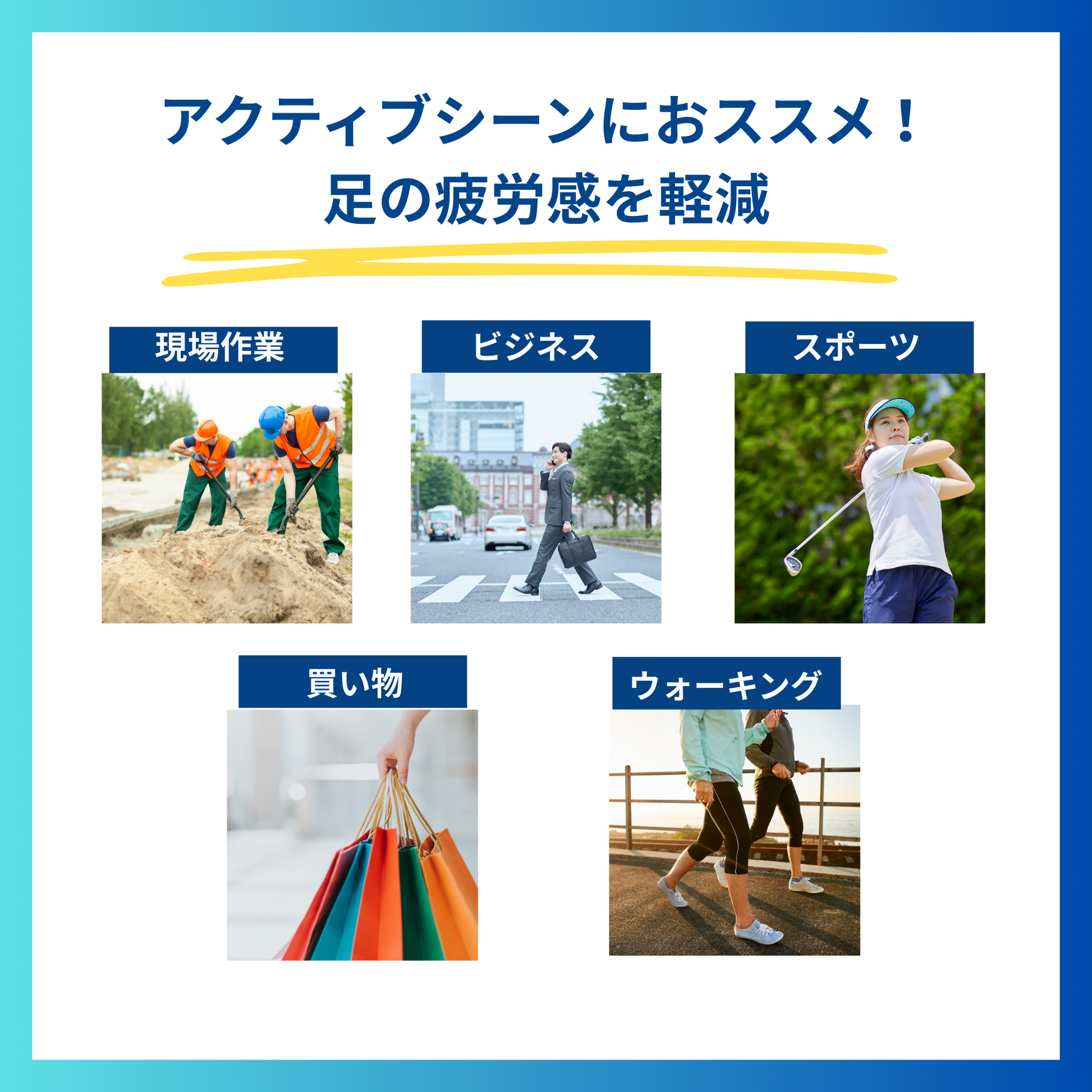 長時間の立ち仕事で足がつらい。夕方になると足裏がジンジンする。安全靴やビジネスシューズでの作業が負担になっている。